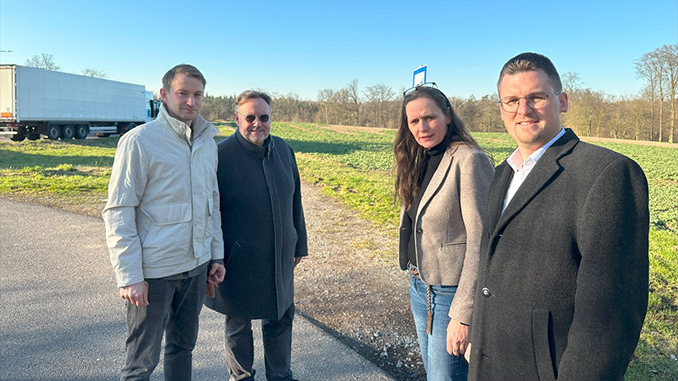 (v.l.) Robin Langer, Michael Droste, Tatjana Pfotenhauer und Bürgermeisterkandidat Patrick Anders am Rand der Raststätte Hösel. Auf dem Feld im Hintergrund sollen die Parkplätze in unmittelbarer Nähe zur Wohnbebauung entstehen, ohne Lärmschutzwand | © CDU-Fraktion Ratingen