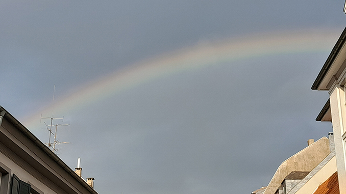 Und plötzlich spannte sich ein Regenbogen über den Himmel – just in dem Moment, als die Demonstrierenden des ersten Christopher Street Day (CSD) auf dem Marktplatz eintrafen. Für viele war das ein ergreifender Augenblick. Manche hatten Tränen in den Augen, als am Stolperstein für den Ratinger Theodor Ropertz die Geschichte des Mannes erzählt wurde, der wegen seiner Homosexualität von den Nationalsozialisten verhaftet, deportiert und in einem Konzentrationslager ermordet wurde.