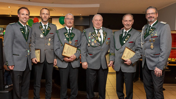 Die Pokalsieger und Pfänderschützen wurden geehrt. Auch gab es mehrere Kompaniejubiläen zu feiern. Für 25 Jahre Mitgliedschaft wurde Sebastian Dübbers geehrt, für 40 Jahre Bernd Teege und für 50 Jahre wurde Ehrenvorstandsmitglied Volkmar Schrimpf geehrt. Und dann gab es noch die Ehrungen für 60 Jahre Mitgliedschaft für Rechtsanwalt Wolfgang Leyendecker. Der 91-jährige Werner Schleuter sollte sogar für 70 Jahre Mitgliedschaft geehrt werden, konnte aber aus gesundheitlichen Gründen leider nicht an der Veranstaltung teilnehmen.
