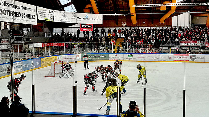 Ratingen. An dieses Spiel werden sich die Zuschauer sicher sehr lange zurückerinnern. Nach einem guten Start der Ice Aliens und der 1:0-Führung durch Brooklyn Beckers kamen die Eagles ins Spiel und stellten bis zur 25. Minute vor allem durch Ex-DEL 2 Spieler Lennart Otten auf 4:1. Cheftrainer Frank Gentges nahm eine Auszeit und spielte von dort an bis zum Ende nur noch mit 11 Feldspielern. Mit ihren Tugenden, die das Team auszeichnet, fighteten sich die Jungs zurück ins Spiel. Toni Lamers mit dem 2:4 und Eric Stephan mit dem 3:4 ließen noch im zweiten Drittel leise Hoffnung aufkeimen.