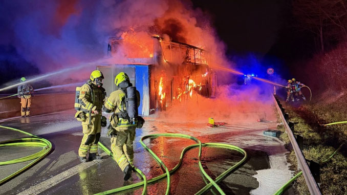 Ratingen. Am frühen Morgen des 6. Februar 2026 wurde die Feuerwehr zu einem Brandereignis auf die Bundesautobahn 52 alarmiert. Gegen 06:55 Uhr meldeten mehrere Anrufer einen brennenden Reisebus auf der BAB 52 in Fahrtrichtung Essen, kurz vor der Ruhrtalbrücke.