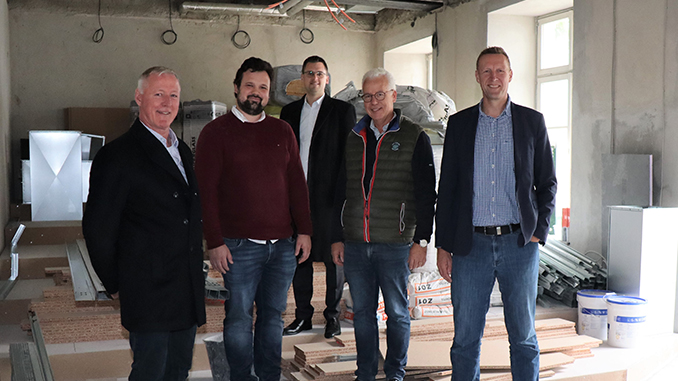 Noch ist der Kinosaal 1 eine Baustelle, aber die Kinobetreiber Thomas und Julian Rüttgers (2.v.r. bzw. 2.v.l.), Hochbaudezernent Martin Gentzsch (r.), Kulturdezernent Patrick Anders (M.) und Stefan Elias, Leiter des Amtes für Gebäudemanagement (l.) sind guter Dinge, dass das Kino in der Adventszeit eröffnen wird. Die Podeste für die Sitzreihen sind bereits eingebaut. Foto: Stadt Ratingen