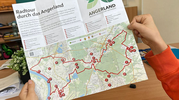 In den vier vierten Klassen zeigte er anhand illustrierter Fahrradkarten, die zum 50. Jubiläum der Eingliederung der früheren Angerlandgemeinden nach Düsseldorf bzw. Ratingen herausgegeben wurden (s. Bild), den 90 Schülerinnen und Schülern u.a. die waldreiche Umgebung Hösels.