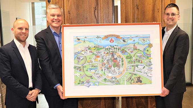 Bürgermeister Patrick Anders (rechts) freut sich sehr über das gelungene Wimmelbild zum Stadtjubiläum, das Jesper Erichsen, Mitglied der Geschäftsführung, und Philipp Anger von DKV Mobility im Rathaus überreichten.