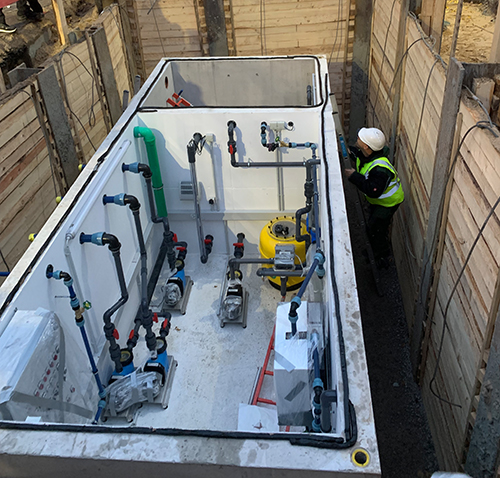 Die neue Brunnenkammer ist in einer Höhe von rund zwei Metern bequem begehbar. Der Betonkubus besteht aus zwei Kammern, eine enthält das Wasserreservoir, die zweite die Technik mit Pumpe und Reinigungssystem. Mit der neuen Brunnentechnik wird sichergestellt, dass der 50 Jahre alte Löwenbrunnen, inzwischen ein Wahrzeichen der Stadt, wieder zuverlässig sprudelt, was die alte Technik zuletzt nicht mehr gewährleisten konnte. Die alte Brunnenkammer, eher ein Kriechkeller unter dem Brunnen, bleibt übrigens bestehen, Teile des Leitungssystems werden weitergenutzt.