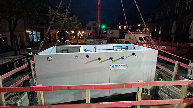 Für die neue Brunnenkammer mit den Ausmaßen einer Fertiggarage musste eine sieben mal fünf Meter große und 3,30 Meter tiefe Baugrube erstellt werden, diese Arbeiten liefen seit rund vier Wochen. Dabei hatte sich bei den Bohrarbeiten für die Stahlträger des Baugrubenverbaus der vorhandene Fels – zumindest an einigen Stellen – als deutlich massiver als erwartet dargestellt und die Arbeiten waren dadurch langsamer vorangekommen. Die ausführende Firma und die Stadtverwaltung haben jedoch alles darangesetzt, damit die Brunnenkammer trotz der Hindernisse noch im Oktober eingesetzt werden kann – insbesondere auch im Hinblick auf den Weihnachtsmarkt, dessen Start unbedingt gesichert sein musste. Dieses Ziel ist erreicht.