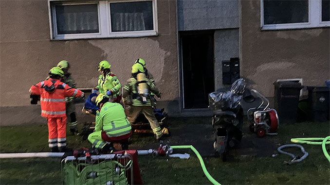 Bei Eintreffen quoll bereits dichter Rauch aus einem Fenster im ersten Obergeschoss. Es wurde umgehend ein Trupp unter schwerem Atemschutz mit einem Löschrohr und Brechwerkzeug zur betroffenen Wohnung beordert. Nachdem sich der eingesetzte Trupp Zugang in die Wohnung verschafft hatte, konnten die Einsatzkräfte schnell die vermisste Person im Rauch lokalisieren, aus der Wohnung retten und mit der Unterstützung eines weiteren Trupps, ins Freie transportieren. Dort wurde der Gerettete dem Rettungsdienst übergeben. Die Brandursache, ein brennender Topf auf dem Herd, wurde im Anschluss abgelöscht und die Wohnung belüftet. Der Bewohner wurde vom Notarzt untersucht und mit einem Rettungswagen in ein Krankenhaus transportiert.