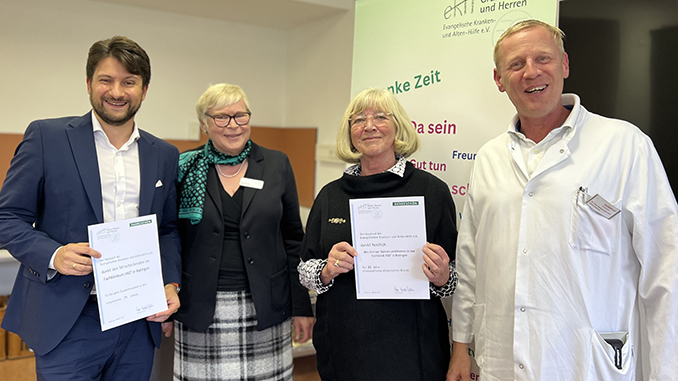 Stolz auf 35 Jahre ehrenamtliches Engagement in der Fachklinik 360° (v. l. n. r.): Svetlin Tontchev (Geschäftsführer Fachklinik 360°), Elke Grothe-Kühn (Bundesvorsitzende eKH), Bärbel Bosenius (Leiterin Grüne Damen Ratingen) und Dr. Matthias Echterhoff (Ärztlicher Direktor Fachklinik 360°)