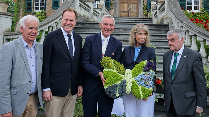 Einen organisch gewachsenen grünen „Angerland-Schmetterling“ brachte Andrea Lindenlaub vom Angermunder Kulturkreis zum Bürgerfest in Linnep mit. Gern dabei waren (v.l.) Siegfried Hoymann, langjähriger Düsseldorfer Ratsherr aus Angermund und Ratinger Amtsleiter, Oberbürgermeister Dr. Stephan Keller, Bürgermeister Klaus Pesch und NRW-Innenminister Herbert Reul.