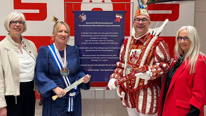 Ratingen. In der Ratinger Hauptfiliale der Sparkasse HRV ist er ein fester Bestandteil der Adventszeit: der alljährliche Weihnachtswunschbaum. Nun steht er wieder reich geschmückt in der Kundenhalle an der Düsseldorfer Straße und wartet auf Menschen, die Wünsche erfüllen möchten – die in Form von Herzen am Baum hängen. In diesem Jahr ist der Baum ein Gemeinschaftsprojekt der Sparkasse HRV und des Ratinger Karnevals-Prinzenpaars, und das aus gutem Grund: Die amtierende Ratingia Claudia III. ist im Hauptberuf Mitarbeiterin der Sparkasse. Deshalb unterstützt der Wunschbaum den Spendenzweck des Prinzenpaars: Alle gespendeten Geschenke kommen dem Kinderschutzbund Ratingen e. V. und der Hospizbewegung Ratingen e. V. zugute.